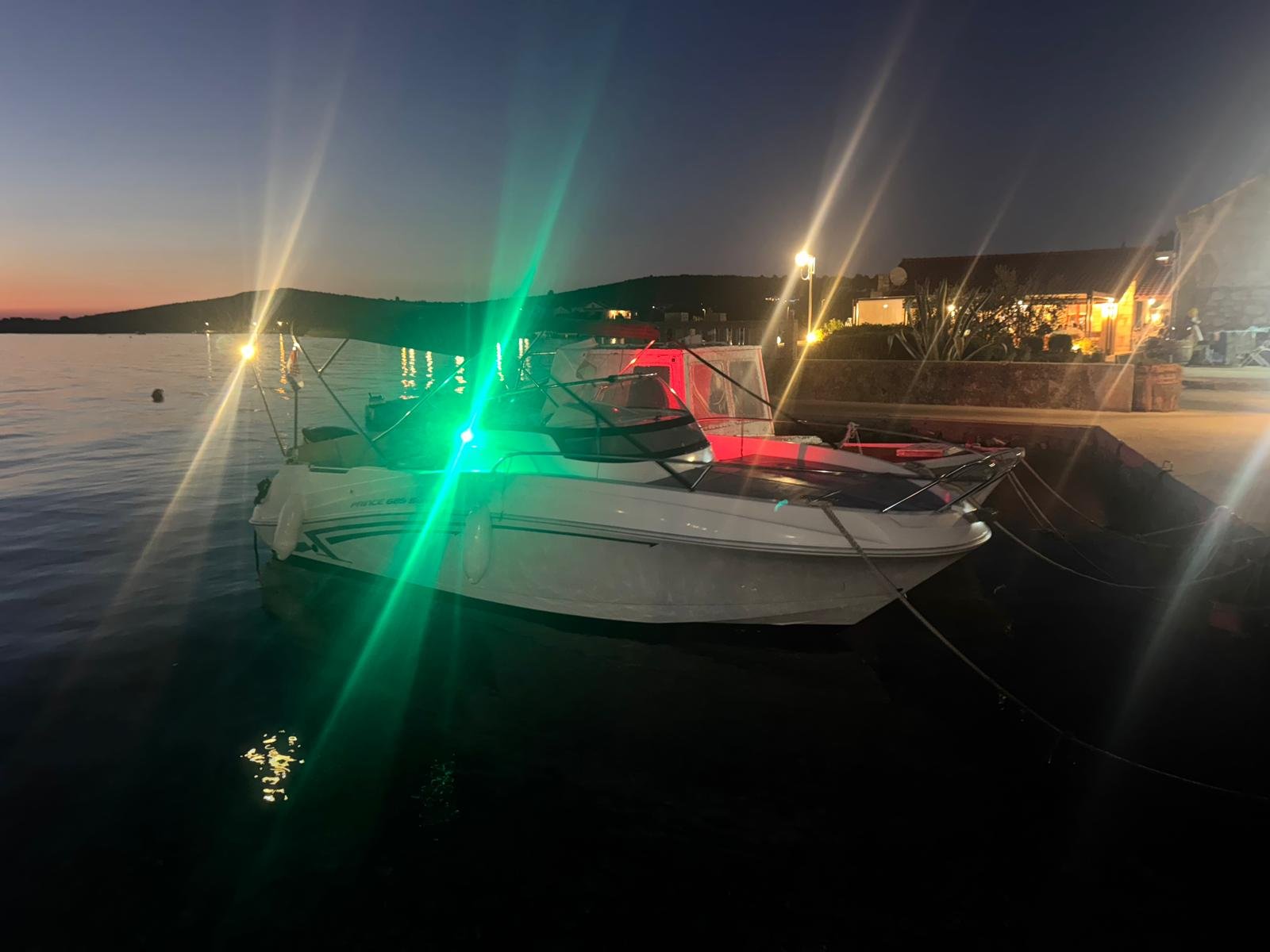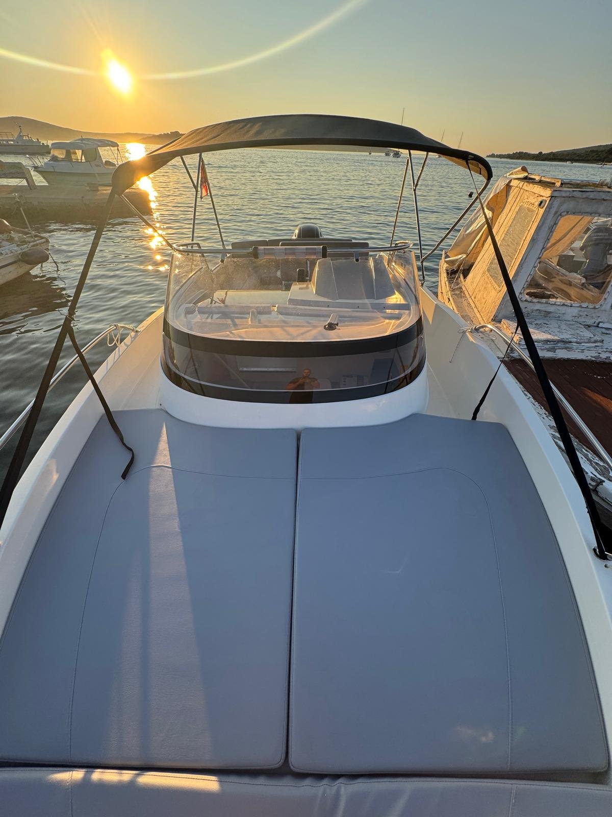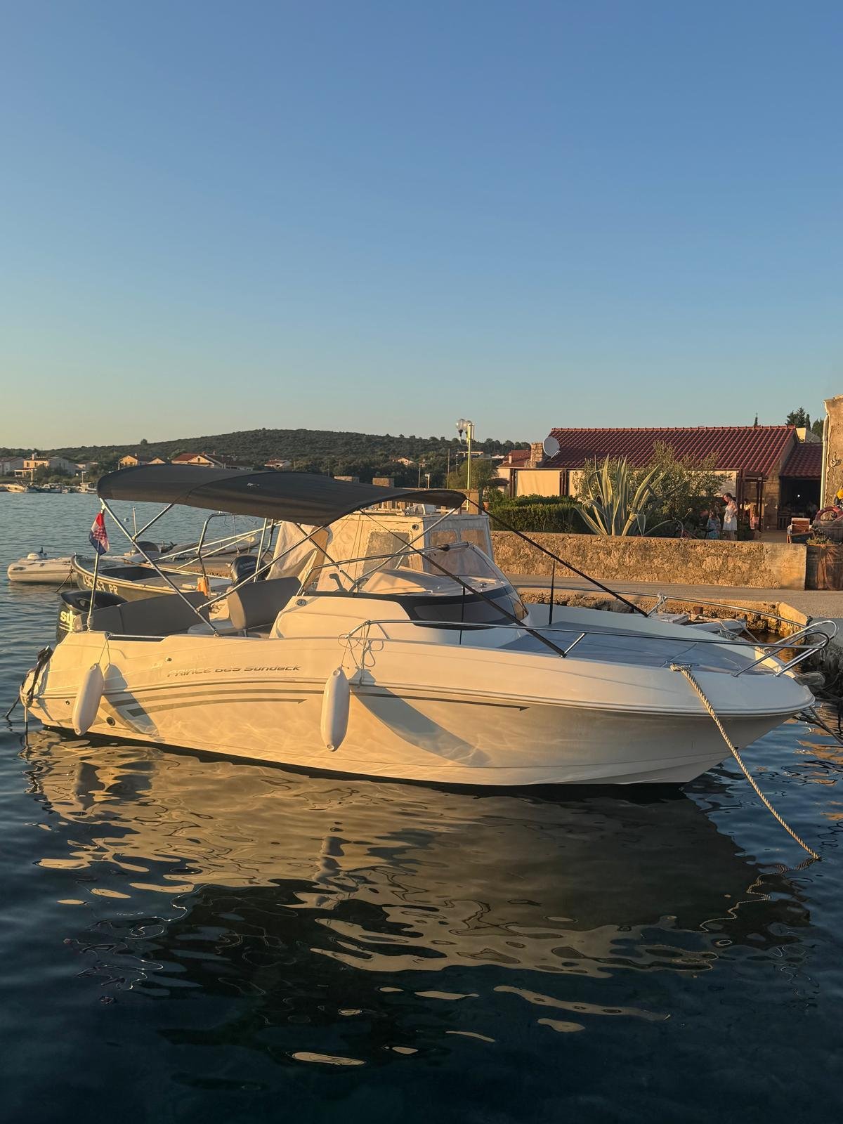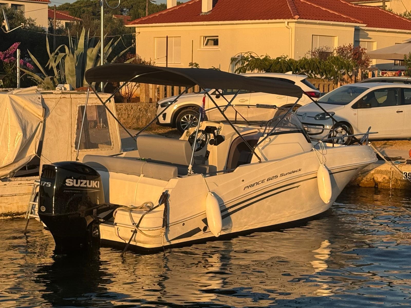 This 2023 Prince 625 Sundeck is suitable for 8 people. It is docked in Muline marina, Croatia. The motorboat Prince 625 Sundeck is equipped with a 175hp engine. When at anchor or in the marina, a bimini proves a great benefit. Cruising with this motorboat is great fun as it is equipped with an outside speakers and an audio system. This motorboat is operated by the charter company Muline Rental.