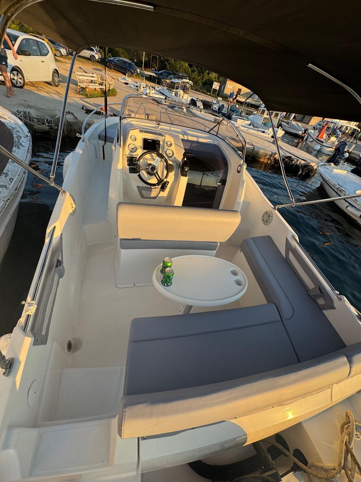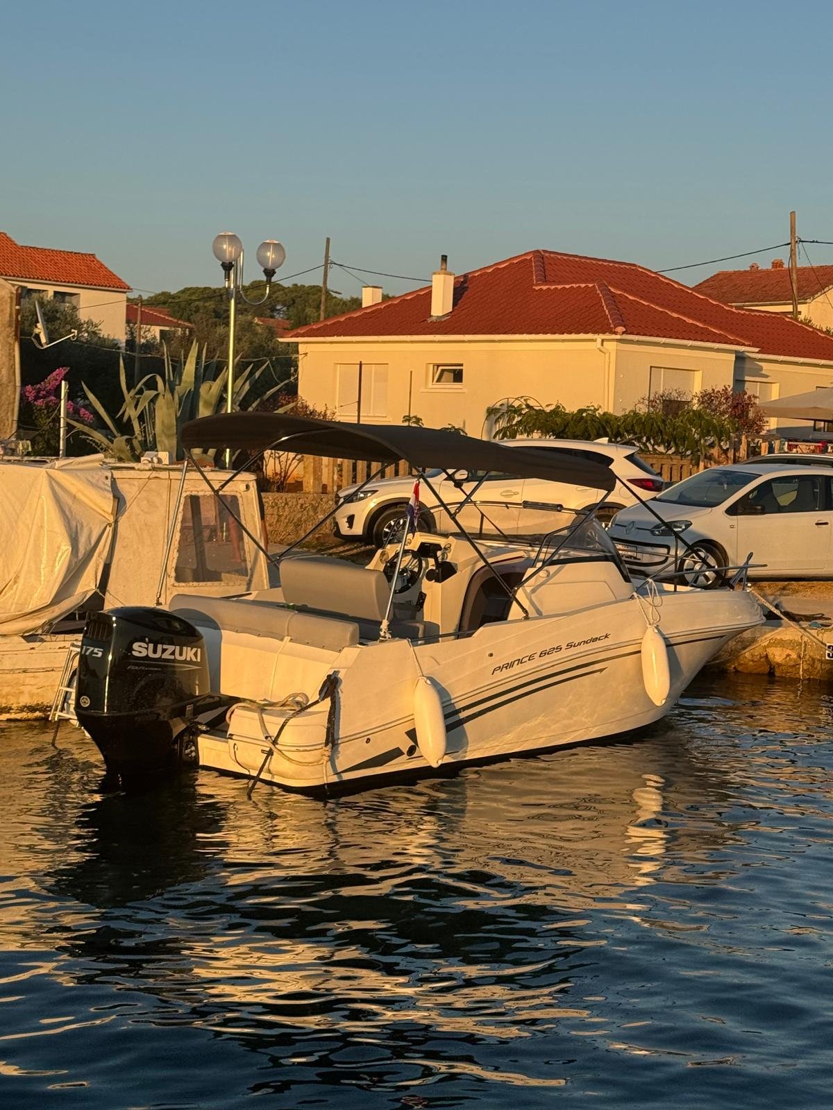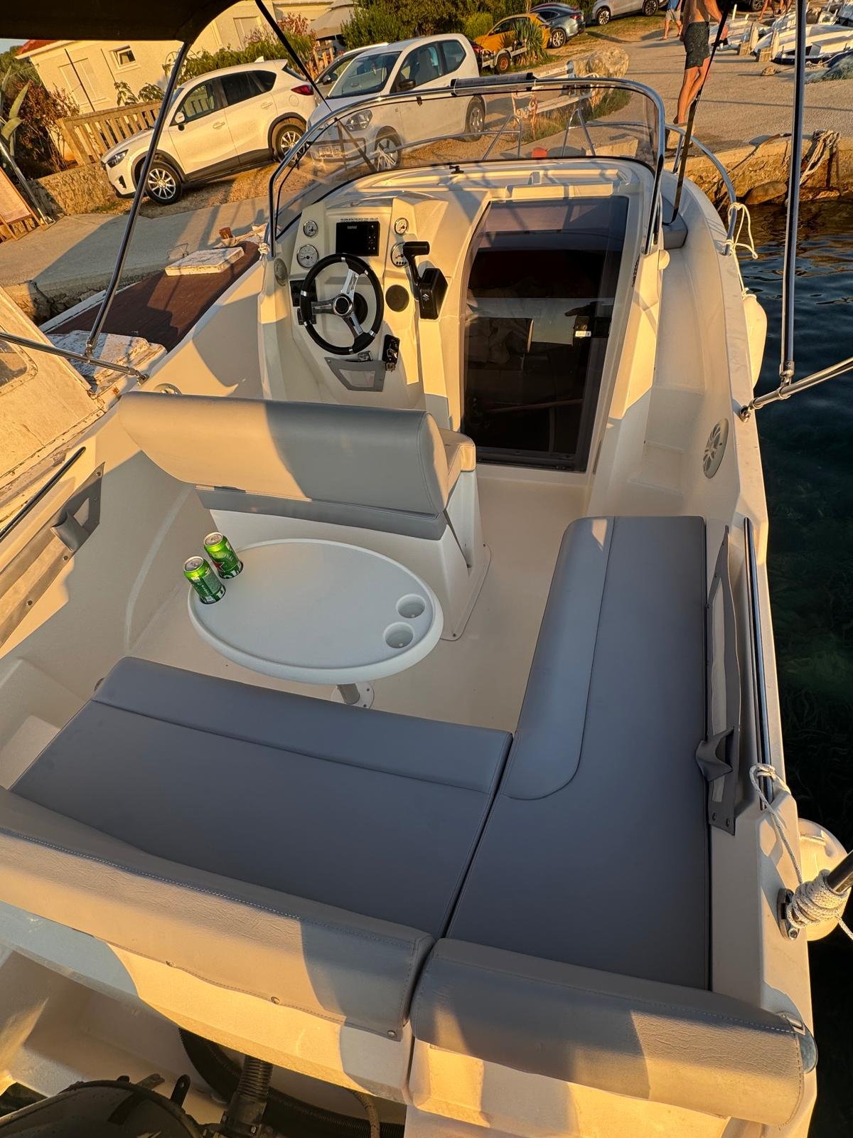 This 2023 Prince 625 Sundeck is suitable for 8 people. It is docked in Muline marina, Croatia. The motorboat Prince 625 Sundeck is equipped with a 175hp engine. When at anchor or in the marina, a bimini proves a great benefit. Cruising with this motorboat is great fun as it is equipped with an outside speakers and an audio system. This motorboat is operated by the charter company Muline Rental.